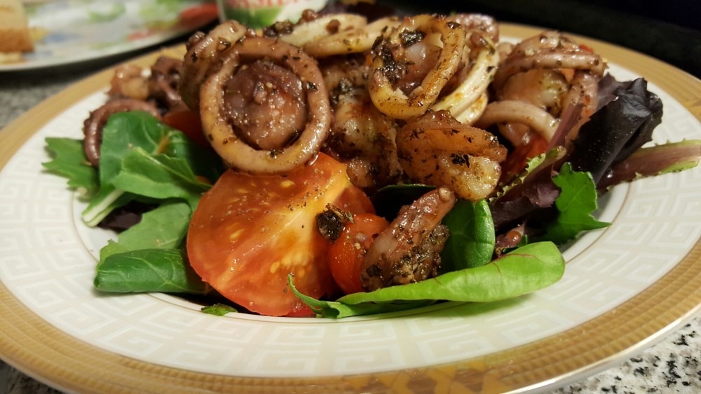 - Add grilled calamari into the salad and sprinkle with balsamic vinegar